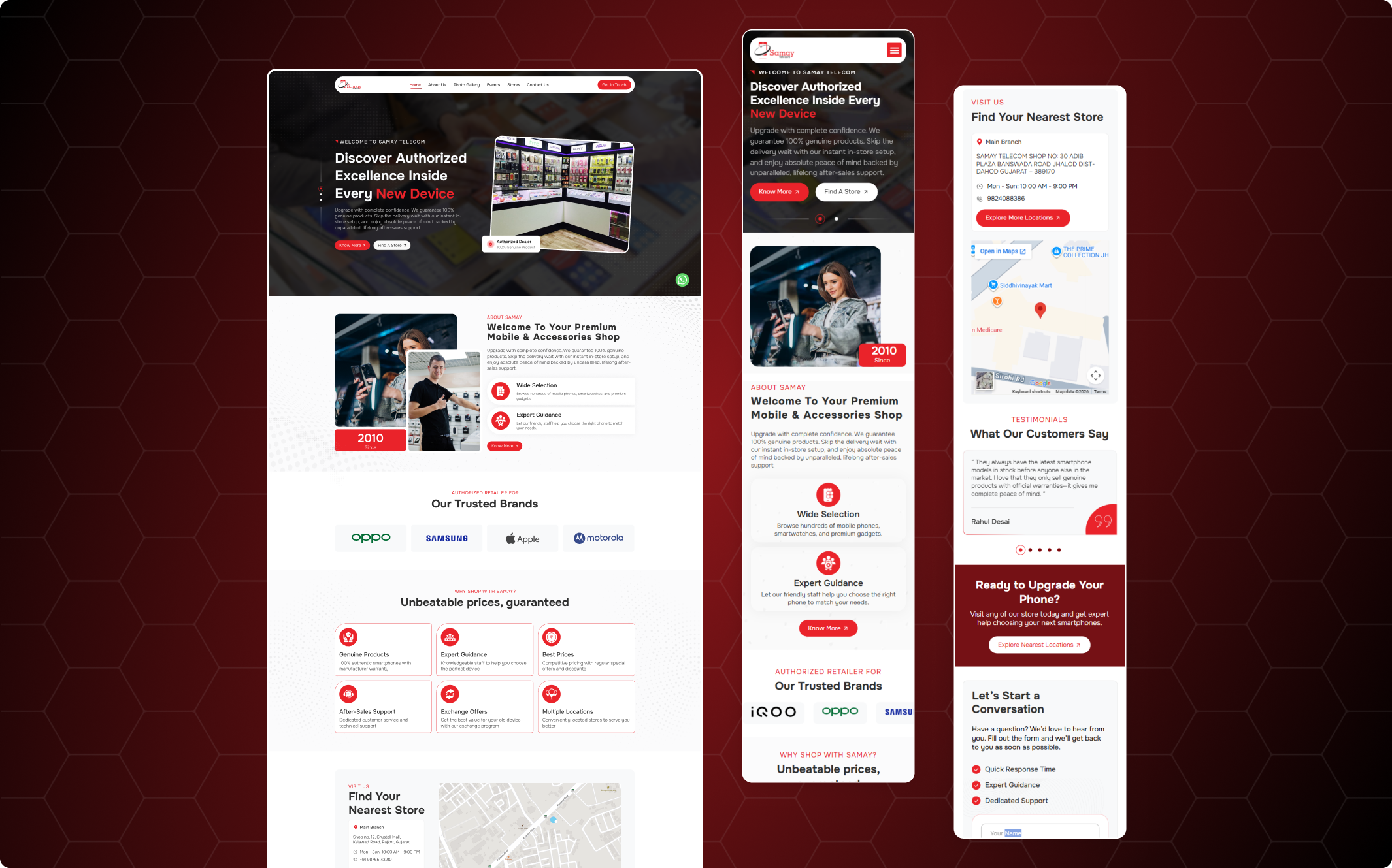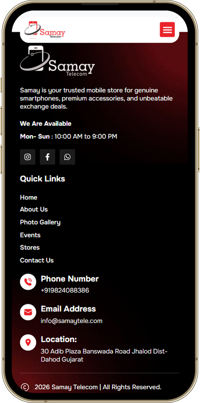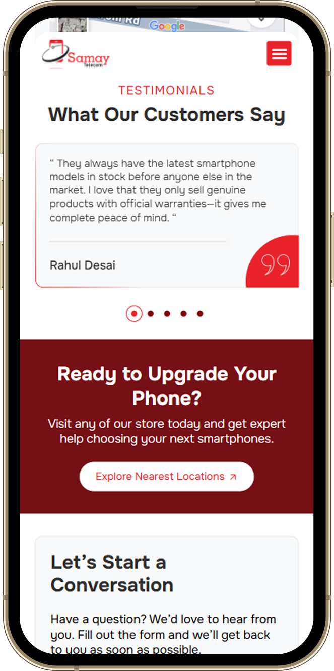 The result is a refined and professional digital platform that establishes Samay Telecom’s online presence with confidence. With a fast, responsive, and SEO-optimized foundation, the website effectively communicates trust and encourages customers to visit physical store locations.
