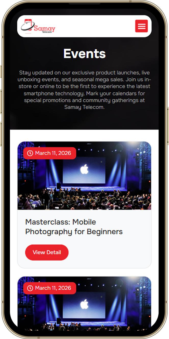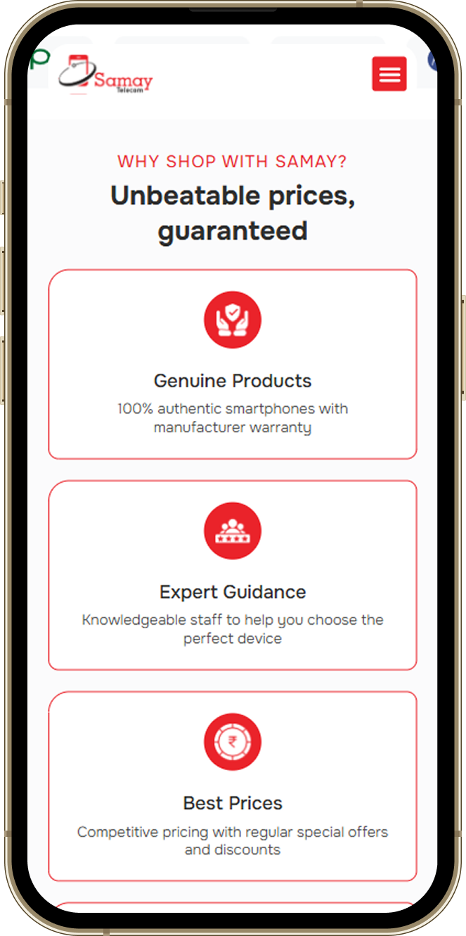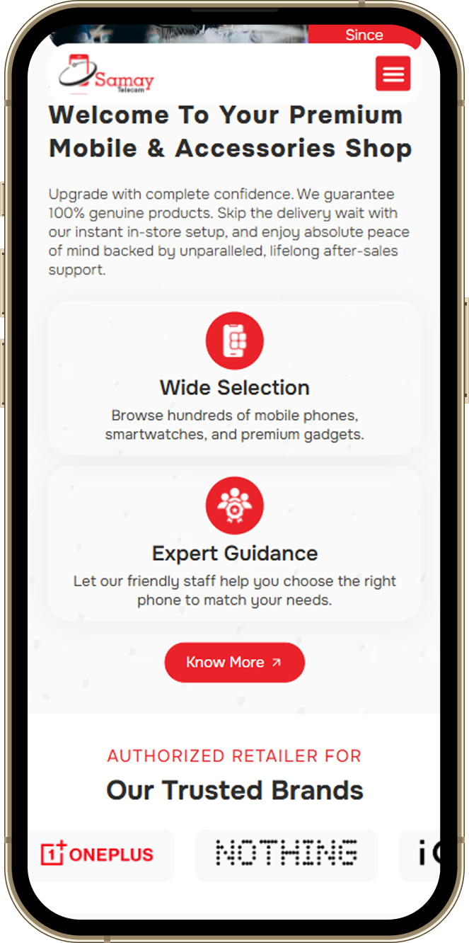A clean and structured informational website showcasing Samay Telecom’s offerings, store locations, and trusted brands. It emphasizes customer benefits, offline shopping advantages, and reliable after-sales support.