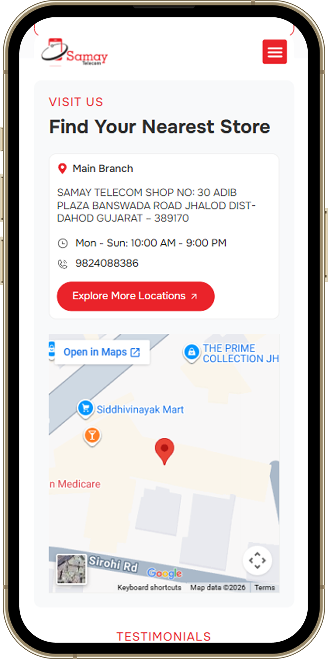 Samay Telecom partnered with us to establish its first digital presence, creating a strong foundation for its mobile and accessories retail business. The objective was to design a clean, informative platform that reflects brand credibility, highlights multiple store locations, and builds customer trust.